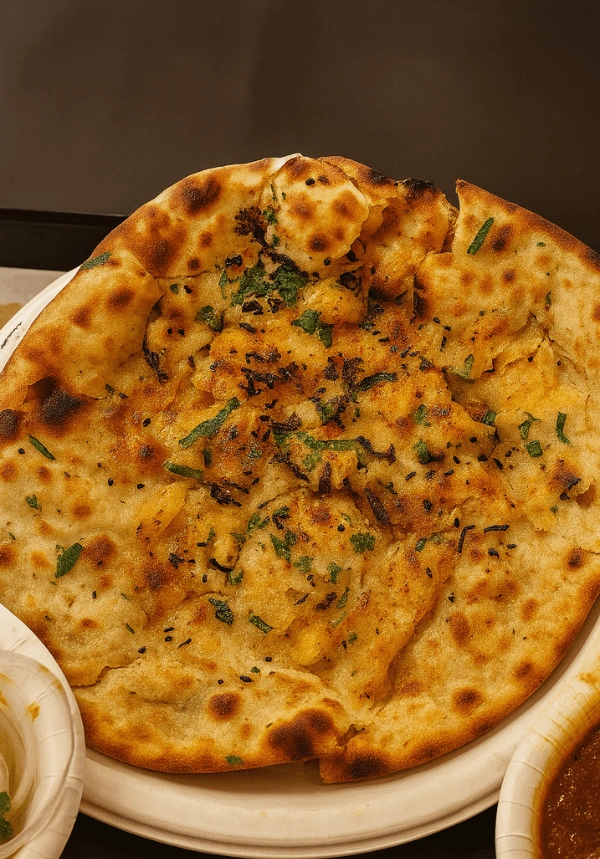 Crispy, flaky naan stuffed with paneer and served with chole